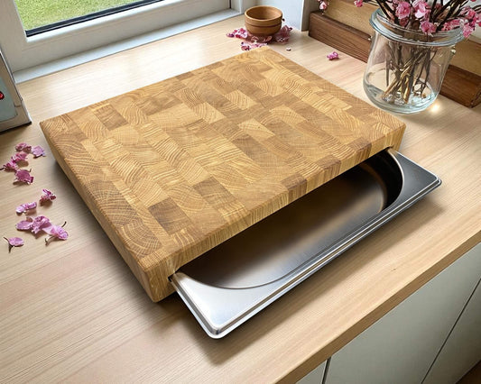 Eichenholz Stirnholz Schneidebrett mit Edelstahl Auffangschale in Handarbeit