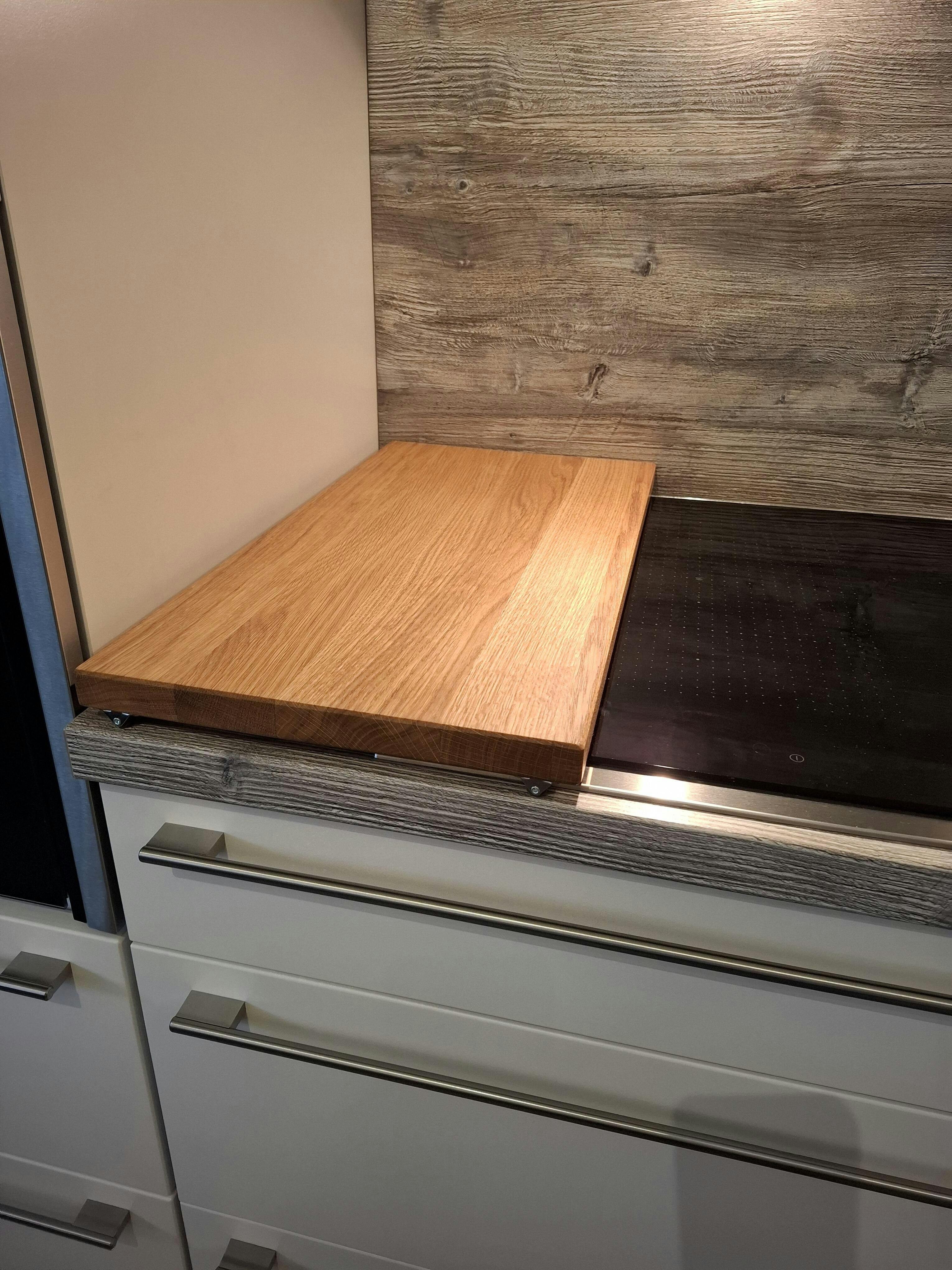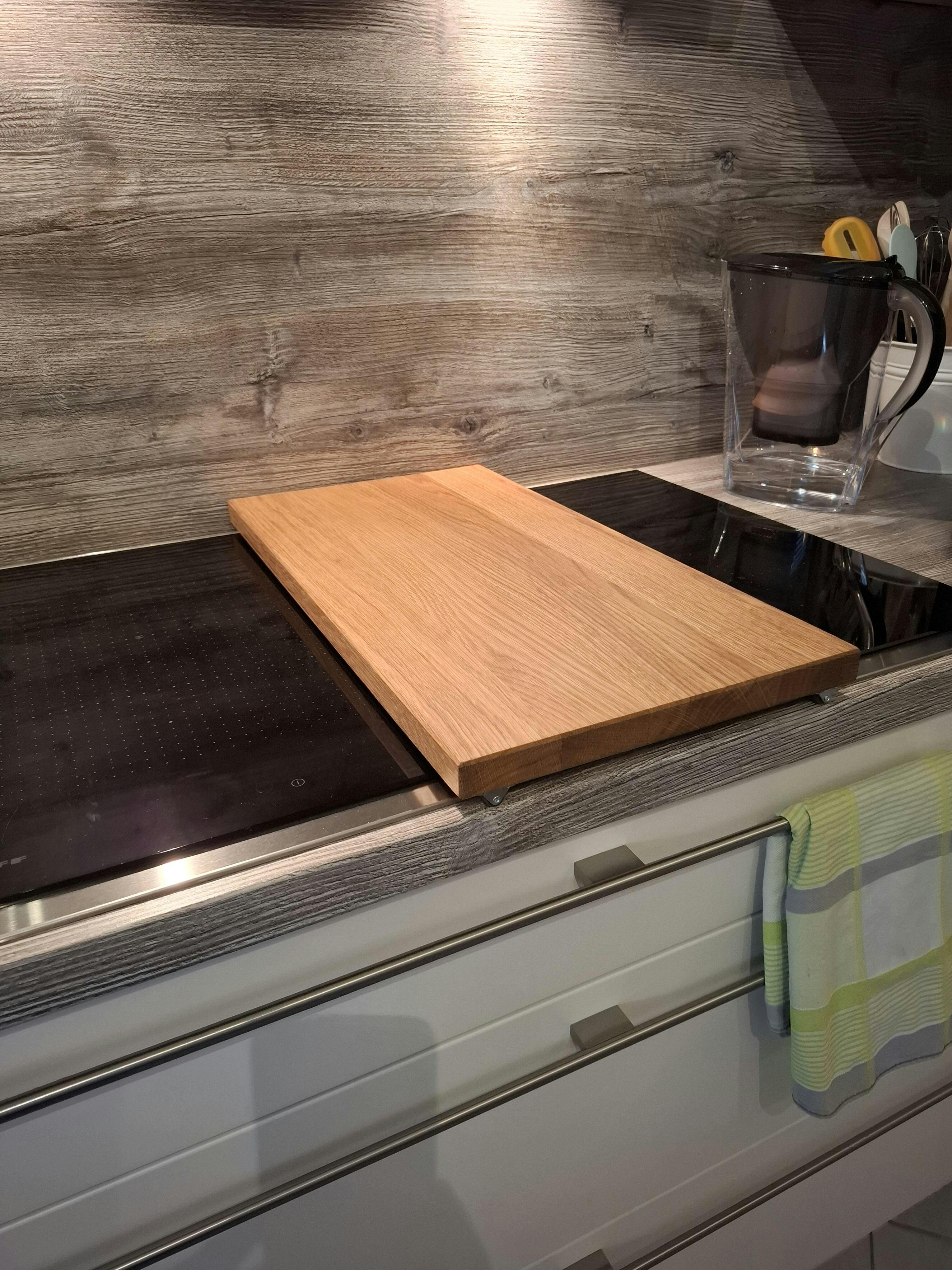 Ein weiteres Highlight dieser Abdeckung ist ihre Verwendung als Schneidebrett. Eichenholz ist ein ideales Material für Schneidebretter, da es die Messer schont und eine angenehme Oberfläche bietet. Ob zum Schneiden von Gemüse, Fleisch oder Brot – das Eichenholz ist robust genug, um allen Anforderungen der täglichen Küchenarbeit standzuhalten, ohne dabei seine Schönheit zu verlieren.