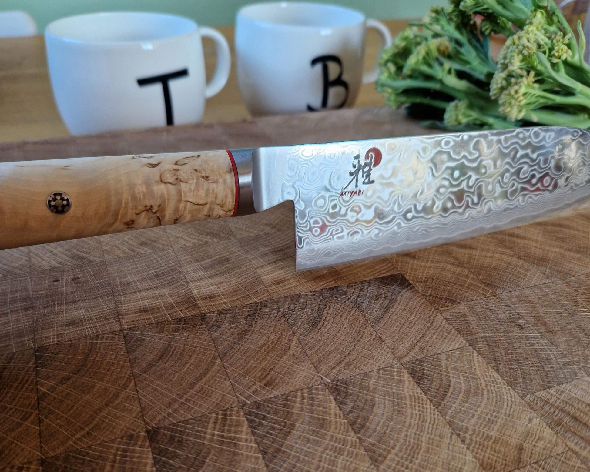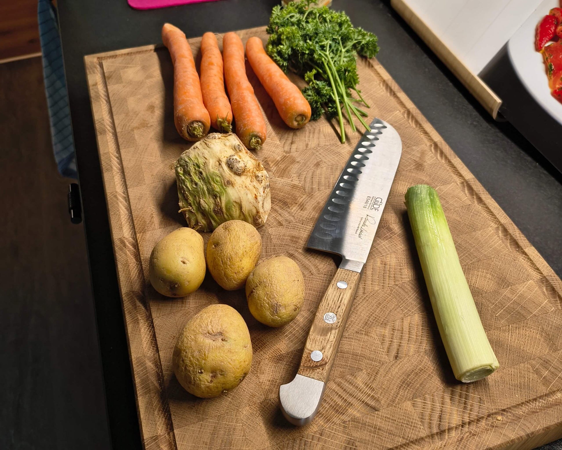 Weil deine Messer nicht quer zu den Holzfasern schneiden, sondern zwischen die stehenden Fasern gleiten. Das sorgt für weniger Abrieb, schont die Klingen und hält sie länger scharf – ganz ohne zusätzlichen Aufwand.